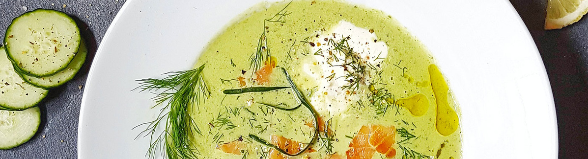 2. Die Schalotten in etwas Öl glasig dünsten. Die Gurkenstücke unterrühren und mit Gemüsebrühe auffüllen, 10 Minuten köcheln lassen. Die Suppe pürieren. Sahne und die Hälfte des Dills dazugeben und mit restlichem Zitronensaft, Salz und Pfeffer abschmecken.
