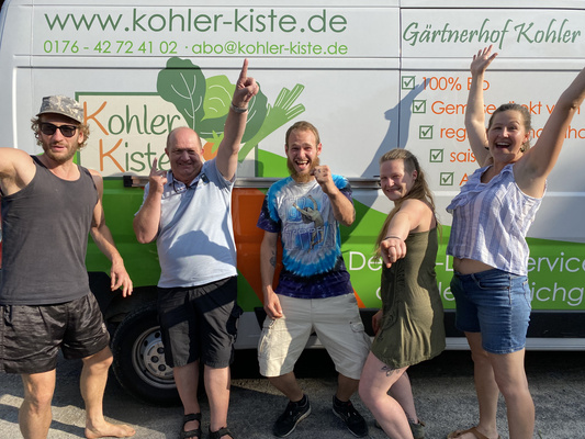 v.l.n.r.: Max (Packer), Jürgen (Fahrer), Felix (Fahrer), Lena & Johanna (Firmeninhaberinnen)