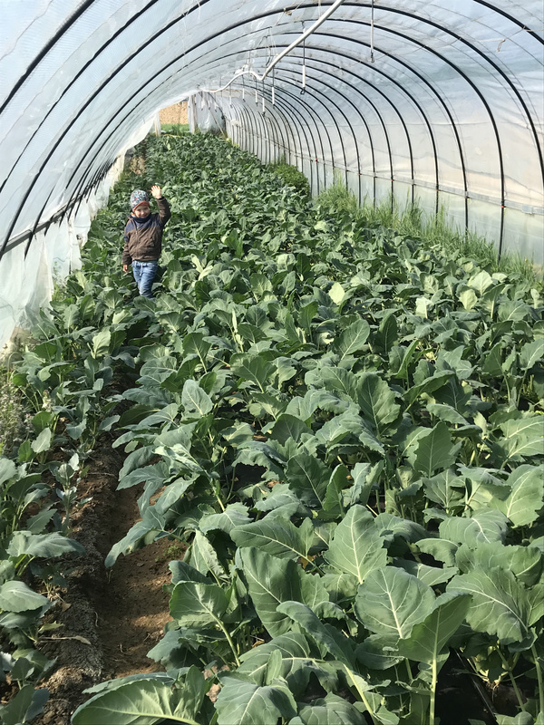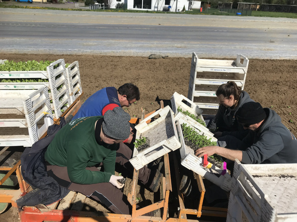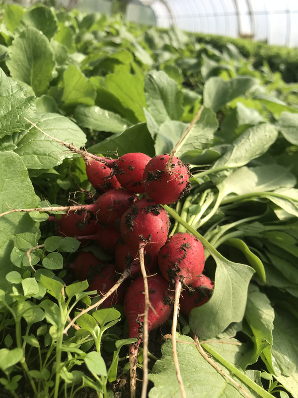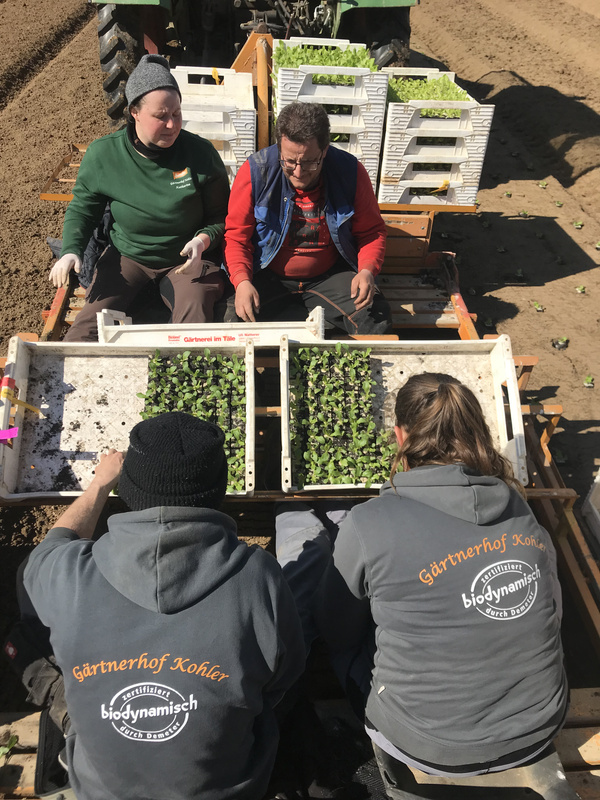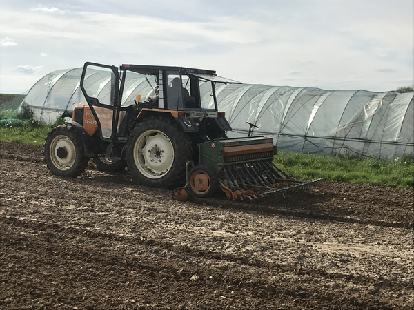 Im April ging's dann endlich mit der Ernte der ersten Salate, Radieschen und Kohlrabi im Gewächshaus los. Alle 2 Wochen pflanzen wir nun wieder Salate und Kohlrabi im Freiland. Die ersten Weißkohl- und Brokkolipflänzchen befinden sich auch auf unseren Feldern. In regelmäßigen Abständen werden Radieschen und Spinat gesät, sodass wir über den Sommer durchweg ernten können. Die regelmäßigen Regengüsse sind natürlich sehr wichtig für unsere Böden, allerdings stehen uns nur kurze Zeitfenster zur Verfügung, um den Boden für die Kulturen vorzubereiten und um die Saaten in den Boden abzulegen. Ende April konnten wir endlich die ersten Rote Bete, Pastinaken und Möhren säen. Mit der großen Sämaschine säen wir auf Flächen, die erst später mit Gemüsekulturen belegt werden, ein Hülsenfruchtgemenge, bestehend aus Wicken, Erbsen und Ackerbohnen. Der Anbau dieser Gründüngung schützt unseren Boden vor Verschlämmung und vor Auswaschung der Nährstoffe durch Starkregenereignisse. Die Gründüngung hat viele weitere Vorteile, u.a. fördert sie das Bodenleben, bildet Humus und reichert Stickstoff im Boden an.