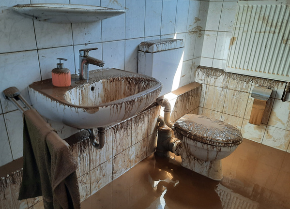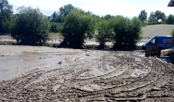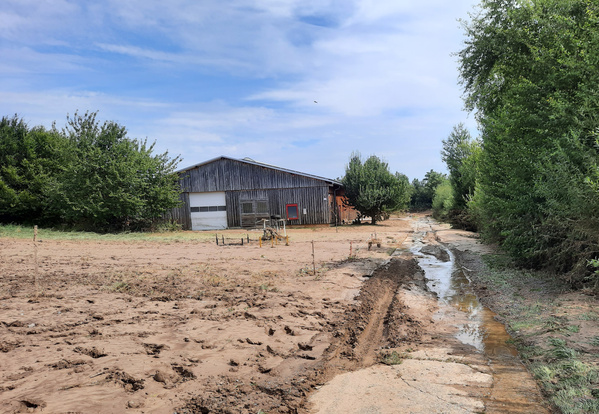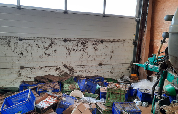 Nach dem Abfließen des Wassers, dann der Schock: nichts steht mehr da wo es einmal stand. Maschinen und Geräte stecken bis zu 50 cm im Schlamm - der von den umliegenden Feldern reingeschlemmt wird.