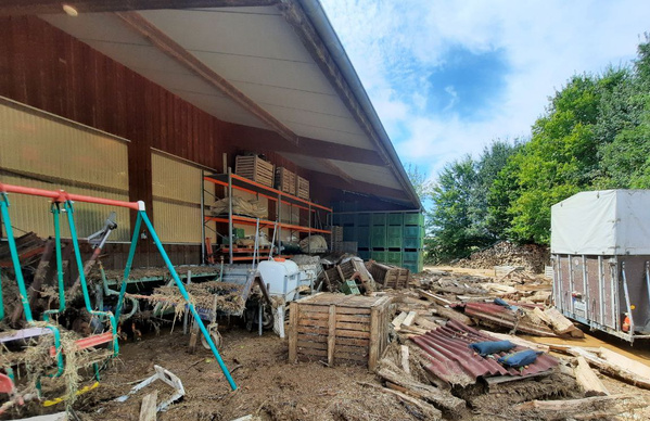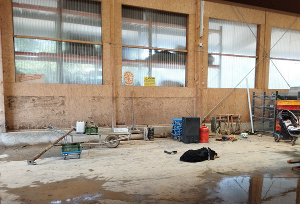 Eine große Wasserflut ereignete sich auch im Bereich unserer landwirtschaftlichen Halle (siehe Bilder). Das Wasser bahnte sich seinen Weg in unser Gebäude und staute sich dort auf einer Höhe von knapp 1,50 m auf.