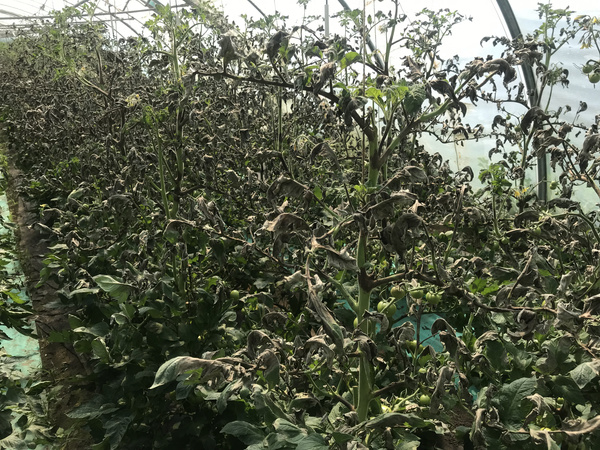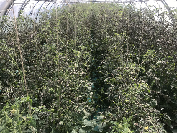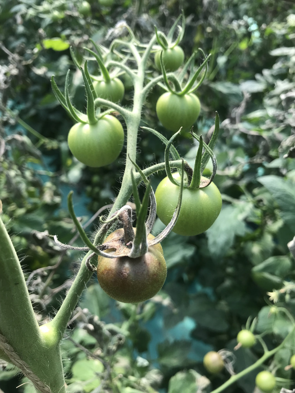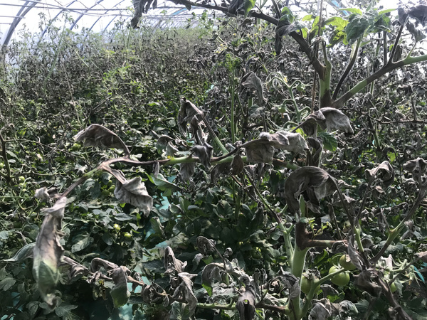 Der Blick ins Gewächshaus ließ uns vor wenigen Tagen erstarren! Es trübt doch sehr die Stimmung, wenn man weiß, wieviele Stunden Arbeit seit Mitte Mai Woche für Woche in die Aufzucht und Pflege unserer 570 Tomatenpflanzen gesteckt wurde, mal ganz abgesehen vom wirtschaftlichen Schaden. Die Nässe der letzten Wochen und damit verbunden die hohe Luftfeuchtigkeit in den Gewächshäusern haben den Pilzen auf unseren Pflanzen eine Lebensgrundlage geschaffen, wie wir sie bisher noch nicht erlebt haben. Innerhalb weniger Tage waren so gut wie alle Tomatenpflanzen im Gewächshaus von Pilzen befallen. Es handelt sich dabei höchstwahrscheinlich um einen Schimmelpilz, der durch den Erreger Botrytis cinerea übertragen wird, und um die bekannte Kraut- und Braunfäule (Phytophthora infestans) . Diese haben sich so schnell ausgebreitet, dass uns keine Zeit zum Handeln blieb. Selbst wenn wir eine Bekämpfungsstrategie hätten angehen können, so sind wir doch durch die Demeter-Richtlinien hier sehr eingeschränkt in unseren Möglichkeiten.