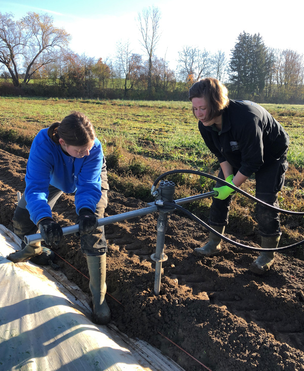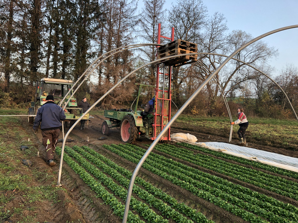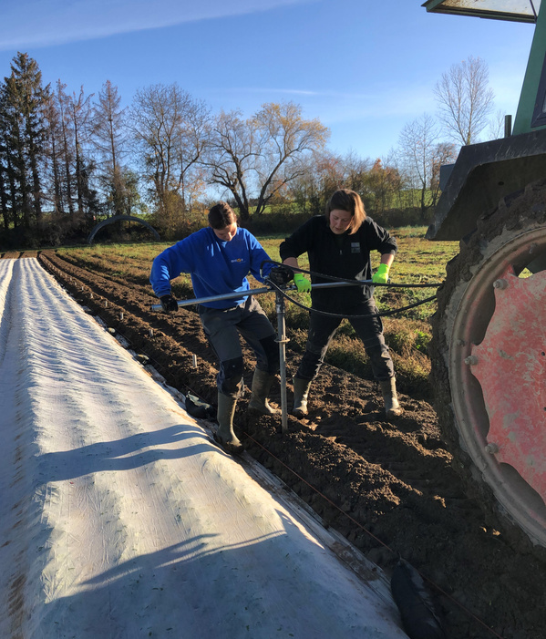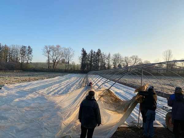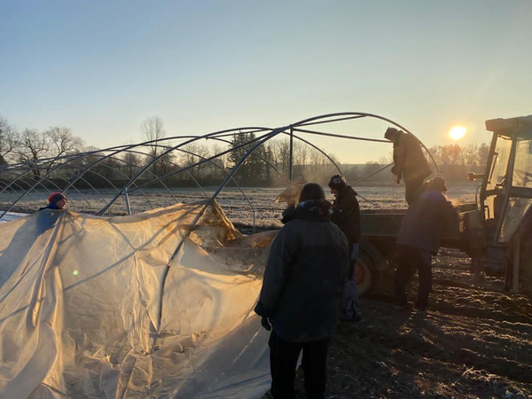 Damit der 100 m lange Folientunnel dem Wetter stand hält, werden Erdanker in den Boden gedreht, in die dann Bögen gesteckt werden. Über diese Bögen wird dann mit einer super-starken Mannschaft die Folie gezogen. Es steckt da einiges an Arbeit dahinter, aber jeder freut sich, wenn bei eisigem Wetter die Ernte inklusive einer Tasse Tee in diesen Tunnel stattfinden kann.