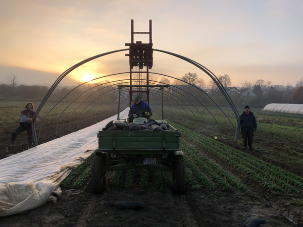 Anfang September gepflanzt, ist ein Teil von unserem Feldsalat, den wir den Winter über ernten, seit dieser Woche von einem sogenannten Haygrove-Tunnel umgeben. Der Folientunnel schützt ihn vor eisiger Kälte und macht selbst bei Minusgraden oder Schnee eine Ernte möglich (und auch gemütlicher ;-)).