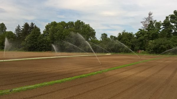 Für rund 4ha Fläche gibt es eine fest installierte Bewässerungsanlage. Diese pumpt Grundwasser aus einem Brunnen, das durch Rohre mit Sprenklern auf die Beete gelangt. Die Rohre werden zwischen die Beete auf vorbereitete Bewässerungsstreifen gelegt. Diese Streifen versehen wir gerne mit einer Gründüngung (s. Bild), die den Insekten zugute kommt und Beikräuter unterdrückt.
